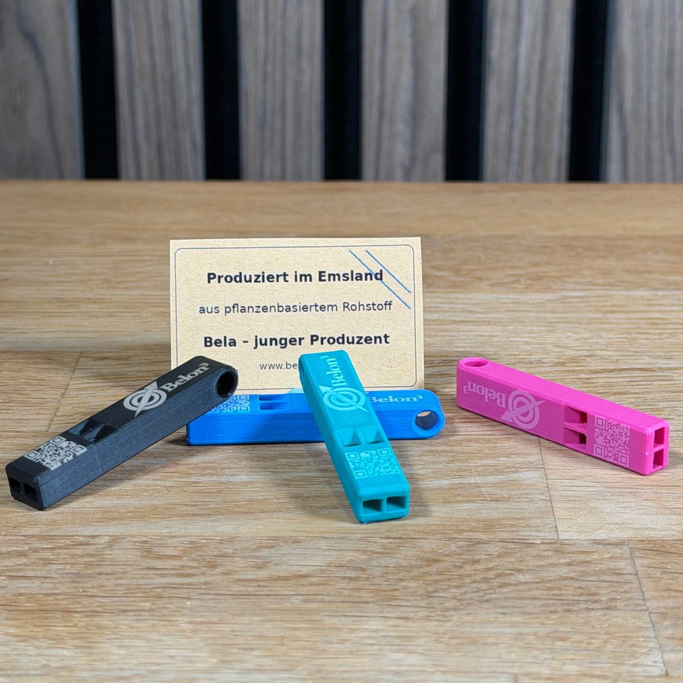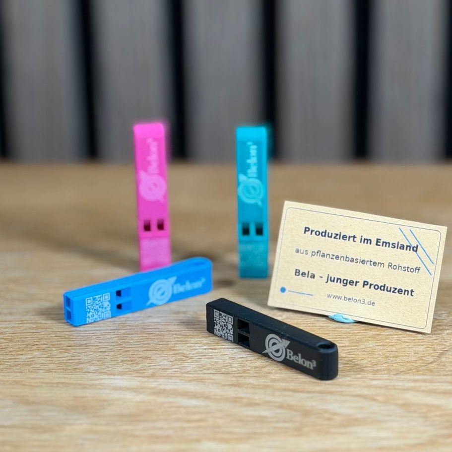 Diese eckige Signalpfeife wird im Emsland im 3D-Druckverfahren gefertigt und besteht aus PLA, ein pflanzenbasierter Rohstoff. Sie erzeugt ein deutlich hörbares, aber nicht übermäßig lautes Signal und eignet sich damit perfekt für Alltag, Sport, Events oder als hochwertiger Werbeartikel.